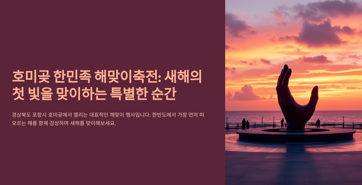 한반도의 가장 동쪽에서 해를 가장 먼저 맞이할 수 있는 곳, 호미곶! 매년 연말과 새해 첫날이 되면 이곳에서는 특별한 **’호미곶 한민족 해맞이축전’**이 펼쳐집니다. 이 축제는 단순히 해돋이를 보는 것 이상의 의미를 지니고 있어요. 가족, 친구, 연인과 함께 잊지 못할 추억을 만들어 보세요. 작년에 다녀온 기억을 떠올려보면, 이 축제는 단순한 이벤트가 아니라 마음속 희망을 다시 피어나게 하는 특별한 경험이었습니다. 2023년 행사에서는 약 20만 명이 넘는 사람들이 모여 한 해의 끝과 새로운 시작을 함께 했는데요, 올해는 더욱 다채롭고 풍성한 프로그램으로 기대감을 높이고 있습니다.